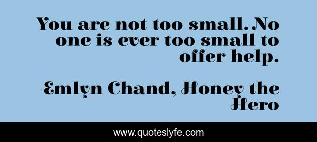 This page presents the quote "You are not too small. No one is ever too small to offer help.". Author of this quote is Emlyn Chand, Honey the Hero. This quote is about kid-lit, children-s-books, honey-the-hero, children, bird-brain-books, picture-books, evolved-publishing, emlyn-chand, birds,.