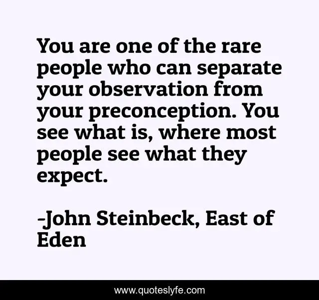 This page presents the quote "You are one of the rare people who can separate your observation from your preconception. You see what is, where most people see what they expect.". Author of this quote is John Steinbeck, East of Eden. This quote is about perception, expectations,.