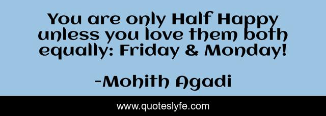 This page presents the quote "You are only Half Happy unless you love them both equally: Friday & Monday!". Author of this quote is Mohith Agadi. This quote is about funny, confidence, monday-morning, positive, motivational, optimistic, comedy, quotes-by-mohith,.