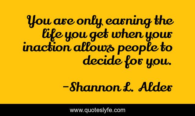 This page presents the quote "You are only earning the life you get when your inaction allows people to decide for you.". Author of this quote is Shannon L. Alder. This quote is about lack-of-goals, life, life-lessons, consequences, lack-of-focus, choices, procrastination, undecided, decisions,.