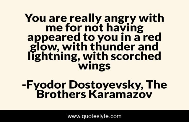 This page presents the quote "You are really angry with me for not having appeared to you in a red glow, with thunder and lightning, with scorched wings". Author of this quote is Fyodor Dostoyevsky, The Brothers Karamazov. .