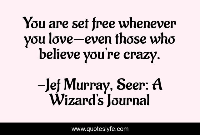This page presents the quote "You are set free whenever you love—even those who believe you're crazy.". Author of this quote is Jef Murray, Seer: A Wizard's Journal. This quote is about relationships, freedom, love, affection,.