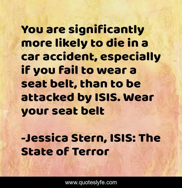 This page presents the quote "You are significantly more likely to die in a car accident, especially if you fail to wear a seat belt, than to be attacked by ISIS. Wear your seat belt". Author of this quote is Jessica Stern, ISIS: The State of Terror. .