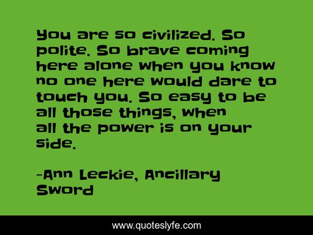 This page presents the quote "You are so civilized. So polite. So brave coming here alone when you know no one here would dare to touch you. So easy to be all those things, when all the power is on your side.". Author of this quote is Ann Leckie, Ancillary Sword. .
