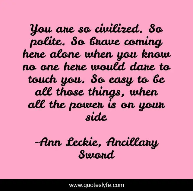 "Ann Leckie, Ancillary Sword Quotes." Quoteslyfe.com, 2025. Fri. 05 Dec. 2025. <https://www.quoteslyfe.com/quote/You-are-so-civilized-So-polite-So-239706>.