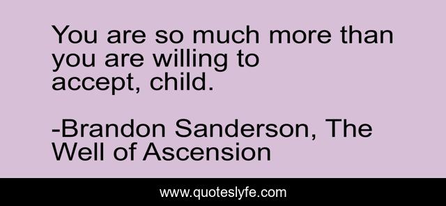 This page presents the quote "You are so much more than you are willing to accept, child.". Author of this quote is Brandon Sanderson, The Well of Ascension. This quote is about self-hatred, acceptance, worth, self-worth,.