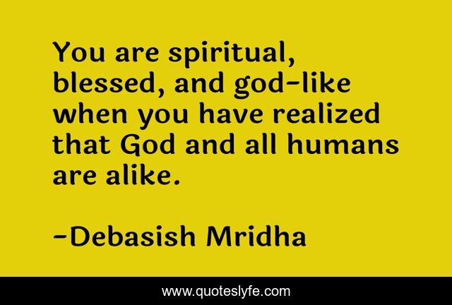 This page presents the quote "You are spiritual, blessed, and god-like when you have realized that God and all humans are alike.". Author of this quote is Debasish Mridha. This quote is about life, love, knowledge, inspirational, intelligence, philosophy, wisdom, quotes, affection,.