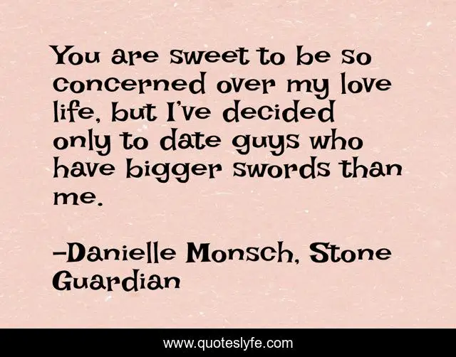 This page presents the quote "You are sweet to be so concerned over my love life, but I’ve decided only to date guys who have bigger swords than me.". Author of this quote is Danielle Monsch, Stone Guardian. This quote is about fantasy-romance, sword-and-sorcery, paranormal-romance,.