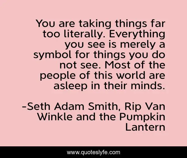 This page presents the quote "You are taking things far too literally. Everything you see is merely a symbol for things you do not see. Most of the people of this world are asleep in their minds.". Author of this quote is Seth Adam Smith, Rip Van Winkle and the Pumpkin Lantern. This quote is about mindfulness, symbol, figurative, asleep, sight, symbolism,.