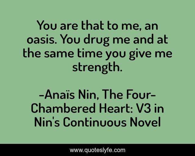 This page presents the quote "You are that to me, an oasis. You drug me and at the same time you give me strength.". Author of this quote is Anaïs Nin, The Four-Chambered Heart: V3 in Nin's Continuous Novel. This quote is about anais-nin, books, book,.