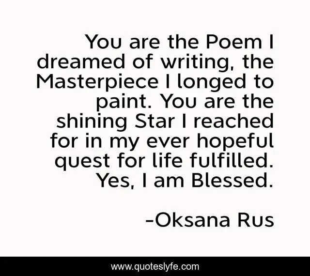 This page presents the quote "You are the Poem I dreamed of writing, the Masterpiece I longed to paint. You are the shining Star I reached for in my ever hopeful quest for life fulfilled. Yes, I am Blessed.". Author of this quote is Oksana Rus. This quote is about spiritual, art, oksana-rus, sky, image, dreamed-of, romance, love, message,.