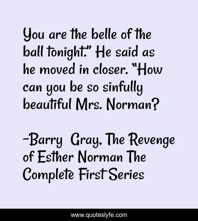 This page presents the quote "You are the belle of the ball tonight.” He said as he moved in closer. “How can you be so sinfully beautiful Mrs. Norman?". Author of this quote is Barry Gray, The Revenge of Esther Norman The Complete First Series. This quote is about fiction, flattery, temptations,.