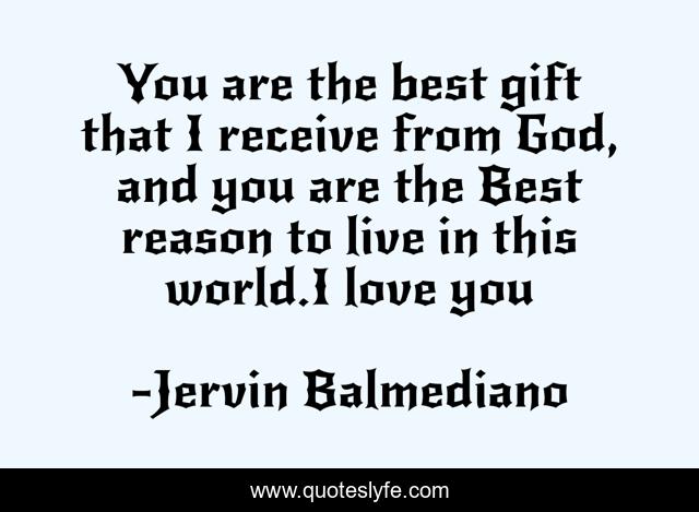This page presents the quote "You are the best gift that I receive from God, and you are the Best reason to live in this world.I love you". Author of this quote is Jervin Balmediano. This quote is about love, gift, god, jervin-balmediano, affection, jaeem-solutions,.
