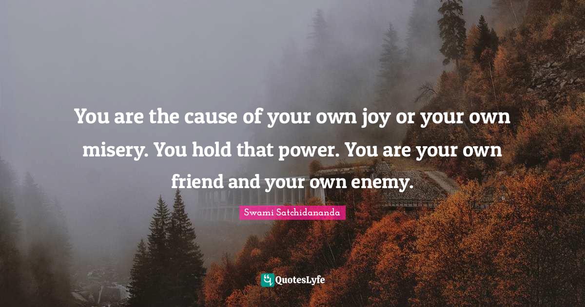 This page presents the quote "You are the cause of your own joy or your own misery. You hold that power. You are your own friend and your own enemy.". Author of this quote is Swami Satchidananda. This quote is about joy, misery, power, enemy, causes,.