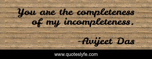 This page presents the quote "You are the completeness of my incompleteness.". Author of this quote is Avijeet Das. This quote is about incompleteness, completeness, love, valentines, writers, passionate-love, affection,.