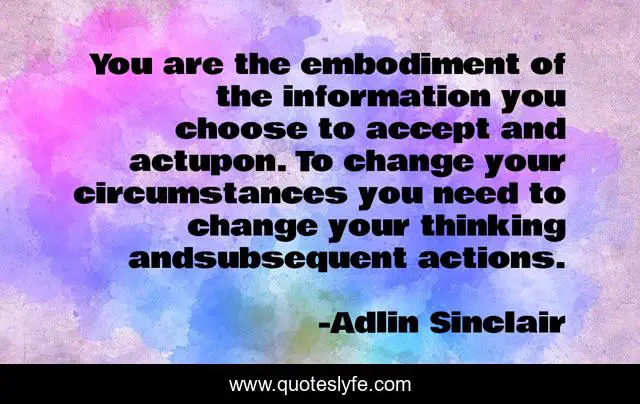 This page presents the quote "You are the embodiment of the information you choose to accept and actupon. To change your circumstances you need to change your thinking andsubsequent actions.". Author of this quote is Adlin Sinclair. This quote is about thinking, information, inspirational, enthusiasm,.