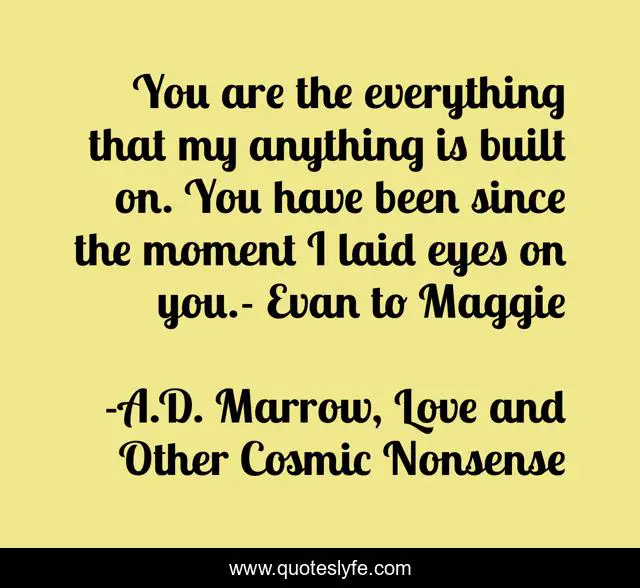 This page presents the quote "You are the everything that my anything is built on. You have been since the moment I laid eyes on you.- Evan to Maggie". Author of this quote is A.D. Marrow, Love and Other Cosmic Nonsense. This quote is about paranormal-romance, entangled-covet,.