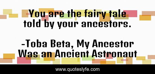 This page presents the quote "You are the fairy tale told by your ancestors.". Author of this quote is Toba Beta, My Ancestor Was an Ancient Astronaut. This quote is about future, fairy-tales, ancestors,.