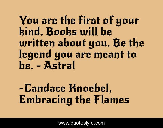 This page presents the quote "You are the first of your kind. Books will be written about you. Be the legend you are meant to be. - Astral". Author of this quote is Candace Knoebel, Embracing the Flames. This quote is about be-yourself, believe-in-yourself, book, books, legend,.