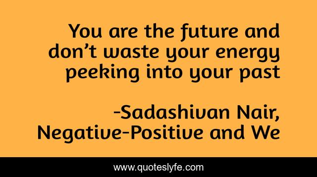 This page presents the quote "You are the future and don’t waste your energy peeking into your past". Author of this quote is Sadashivan Nair, Negative-Positive and We. This quote is about past, future, growth, ambination,.