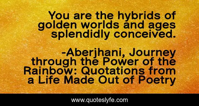 "Aberjhani, Journey through the Power of the Rainbow: Quotations from a Life Made Out of Poetry Quotes." Quoteslyfe.com, 2025. Sun. 07 Dec. 2025. <https://www.quoteslyfe.com/quote/You-are-the-hybrids-of-golden-worlds-26038>.