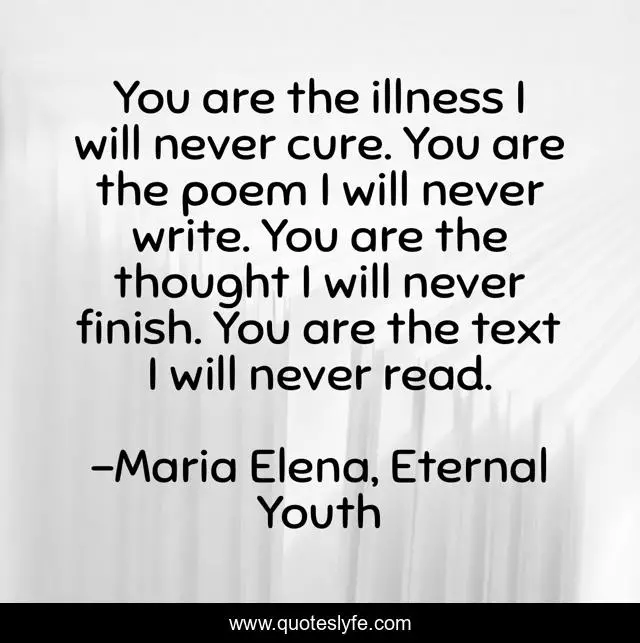 "Maria Elena, Eternal Youth Quotes." Quoteslyfe.com, 2025. Mon. 08 Dec. 2025. <https://www.quoteslyfe.com/quote/You-are-the-illness-I-will-never-35889>.