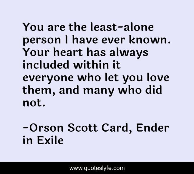 This page presents the quote "You are the least-alone person I have ever known. Your heart has always included within it everyone who let you love them, and many who did not.". Author of this quote is Orson Scott Card, Ender in Exile. This quote is about loneliness, love, affection,.