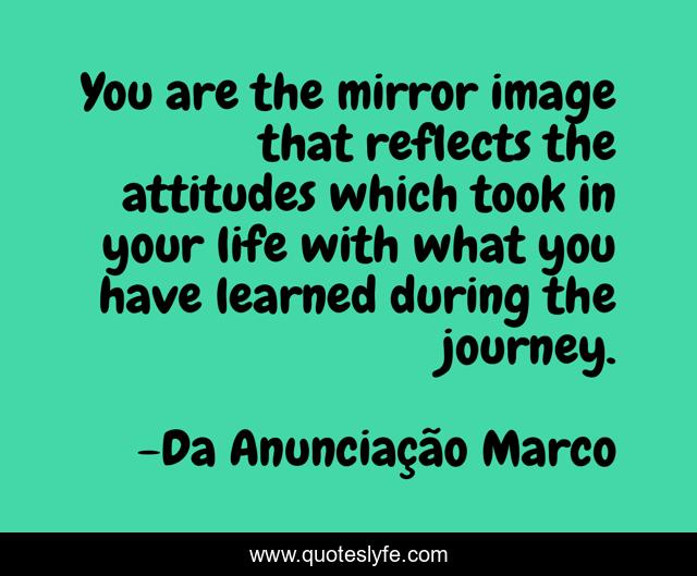 This page presents the quote "You are the mirror image that reflects the attitudes which took in your life with what you have learned during the journey.". Author of this quote is Da Anunciação Marco. This quote is about confidence, self-steem, positive, motivational, optimistic, inspirational, self-help, enthusiasm,.