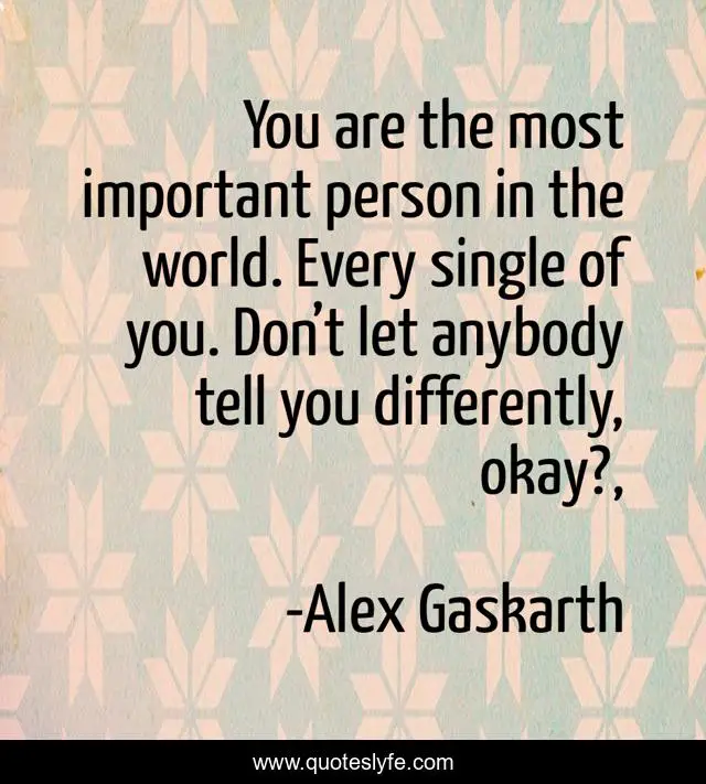 This page presents the quote "You are the most important person in the world. Every single of you. Don’t let anybody tell you differently, okay?, ". Author of this quote is Alex Gaskarth. This quote is about be-yourself, original, spirit,.