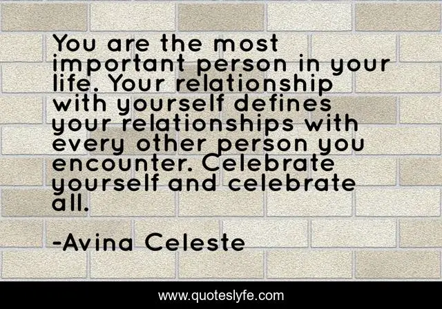 This page presents the quote "You are the most important person in your life. Your relationship with yourself defines your relationships with every other person you encounter. Celebrate yourself and celebrate all.". Author of this quote is Avina Celeste. This quote is about self-acceptance, self-love, self-esteem,.