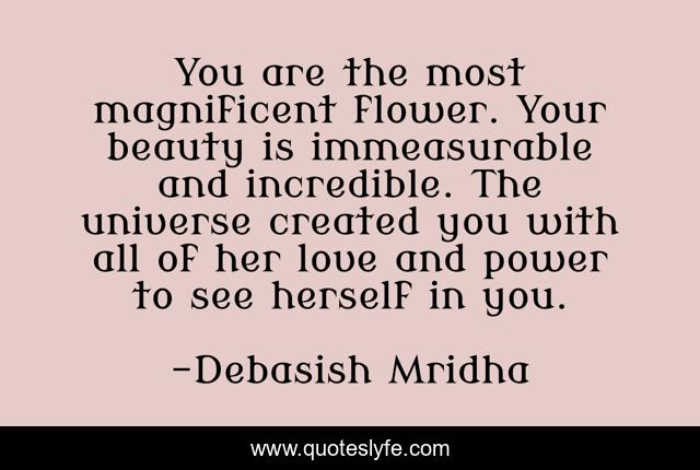 This page presents the quote "You are the most magnificent flower. Your beauty is immeasurable and incredible. The universe created you with all of her love and power to see herself in you.". Author of this quote is Debasish Mridha. This quote is about the-universe-created-you, beauty, universe, philosophy, debasish-mridha, quotes, debasish-mridha-md, inspirational, enthusiasm,.