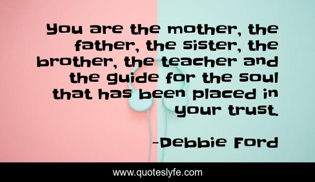 This page presents the quote "You are the mother, the father, the sister, the brother, the teacher and the guide for the soul that has been placed in your trust.". Author of this quote is Debbie Ford. This quote is about sister, trust, father,.