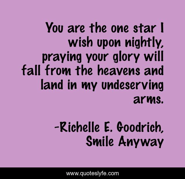 This page presents the quote "You are the one star I wish upon nightly, praying your glory will fall from the heavens and land in my undeserving arms.". Author of this quote is Richelle E. Goodrich, Smile Anyway. This quote is about adoration, heaven, love, lovers, richelle, stars, richelle-goodrich, affection,.