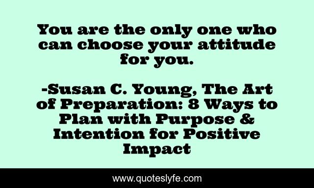 This page presents the quote "You are the only one who can choose your attitude for you.". Author of this quote is Susan C. Young, The Art of Preparation: 8 Ways to Plan with Purpose & Intention for Positive Impact. This quote is about build-confidence, susan-young, relationship, communication-skills, attitude, behaviour, quotes-by-susan-c-young, preparation, mindset,.