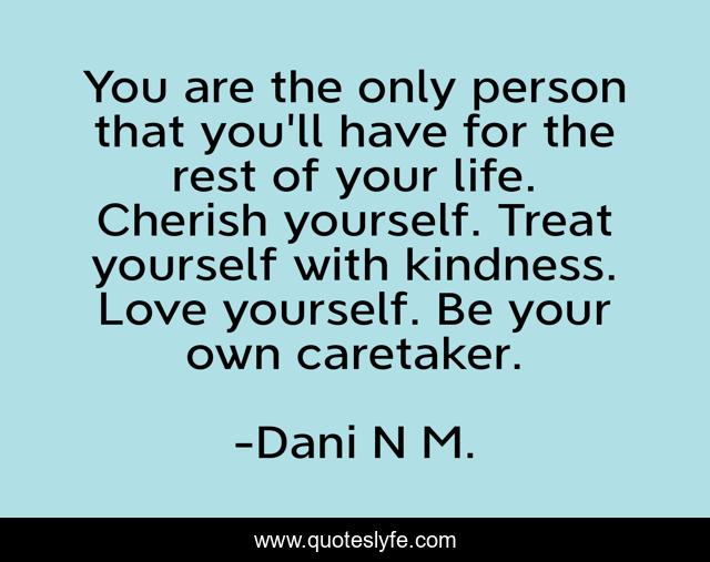 This page presents the quote "You are the only person that you'll have for the rest of your life. Cherish yourself. Treat yourself with kindness. Love yourself. Be your own caretaker.". Author of this quote is Dani N M.. This quote is about love, inspire, self, inspirational, enthusiasm, worth, affection,.