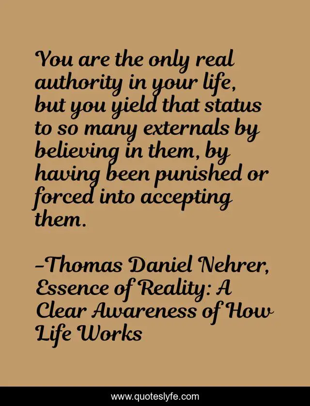 "Thomas Daniel Nehrer, Essence of Reality: A Clear Awareness of How Life Works Quotes." Quoteslyfe.com, 2025. Fri. 05 Dec. 2025. <https://www.quoteslyfe.com/quote/You-are-the-only-real-authority-in-155762>.