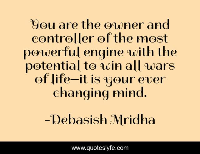 This page presents the quote "You are the owner and controller of the most powerful engine with the potential to win all wars of life—it is your ever changing mind.". Author of this quote is Debasish Mridha. This quote is about life, power-of-the-mind, life-wisdom, philosophy, debasish-mridha, powerful-engine, quotes, potential-of-your-mind, inspirational,.