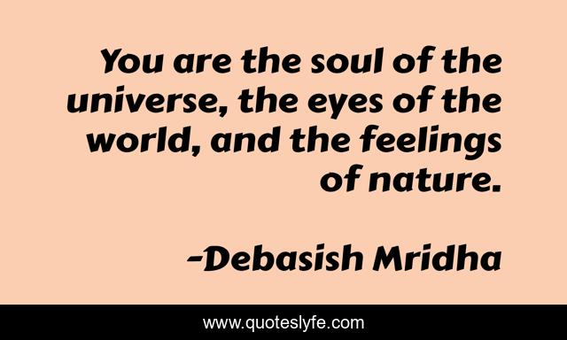 This page presents the quote "You are the soul of the universe, the eyes of the world, and the feelings of nature.". Author of this quote is Debasish Mridha. This quote is about miraboli, oscar-wilde, philosophy, debasish-mridha, quotes, gandhi, inspirational, feelings-of-nature, eyes-of-the-world,.