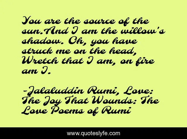 This page presents the quote "You are the source of the sun.And I am the willow's shadow. Oh, you have struck me on the head, Wretch that I am, on fire am I.". Author of this quote is Jalaluddin Rumi, Love: The Joy That Wounds: The Love Poems of Rumi. This quote is about fire, shadow,.