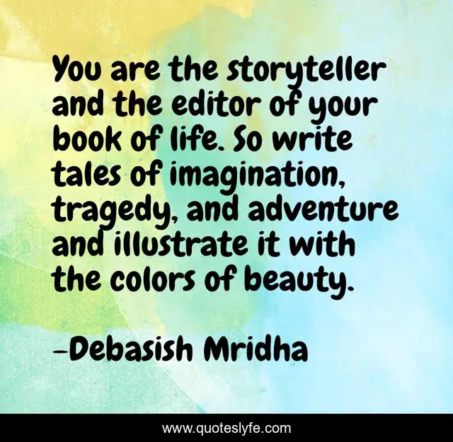 This page presents the quote "You are the storyteller and the editor of your book of life. So write tales of imagination, tragedy, and adventure and illustrate it with the colors of beauty.". Author of this quote is Debasish Mridha. This quote is about imagination, philosophy, debasish-mridha, tell-your-own-story, be-a-writer, quotes, write-tales, adventure, inspirational,.
