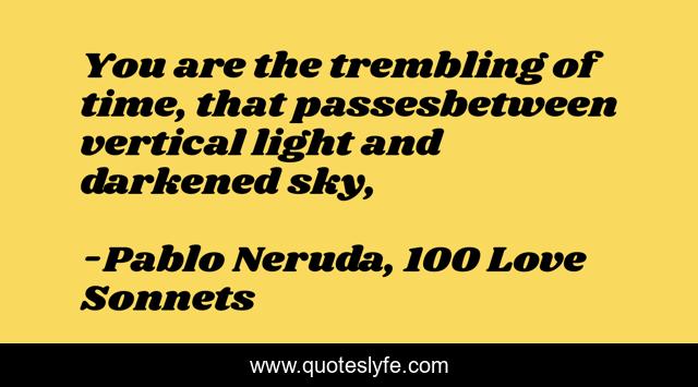 This page presents the quote "You are the trembling of time, that passesbetween vertical light and darkened sky, ". Author of this quote is Pablo Neruda, 100 Love Sonnets. This quote is about dawn, poetic, beauty, nature,.
