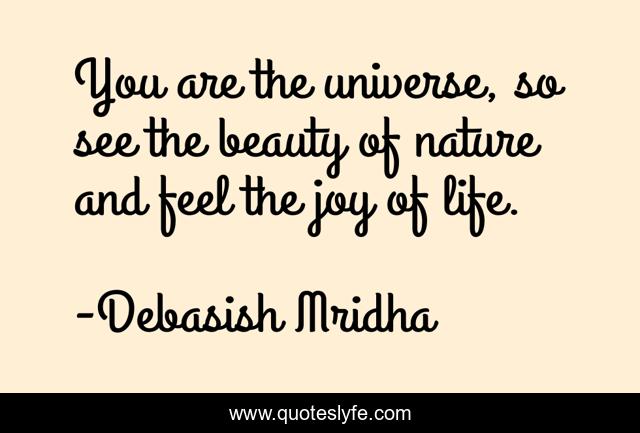 This page presents the quote "You are the universe, so see the beauty of nature and feel the joy of life.". Author of this quote is Debasish Mridha. This quote is about philosophy, beauty, nature, mridha, you-are-the-universe, debasish, debasish-mridha, beauty-of-nature, inspirational,.
