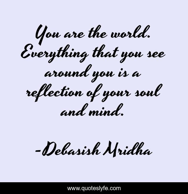 This page presents the quote "You are the world. Everything that you see around you is a reflection of your soul and mind.". Author of this quote is Debasish Mridha. This quote is about miraboli, oscar-wilde, debasish-mridha, philosophy, you-are-the-world, mind-and-soul, tagore, quotes, buddha,.