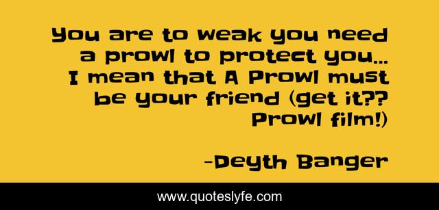 This page presents the quote "You are to weak you need a prowl to protect you... I mean that A Prowl must be your friend (get it?? Prowl film!)". Author of this quote is Deyth Banger. This quote is about protect, vampires, hunters, hunt, prowl, films, guard, need, wow,.