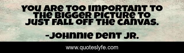 This page presents the quote "You are too important to the bigger picture to just fall off the canvas.". Author of this quote is Johnnie Dent Jr.. This quote is about perseverance, sticking-it-out, stick-to-itiveness, success, importance, winning, greatness, finishing, successful-living,.
