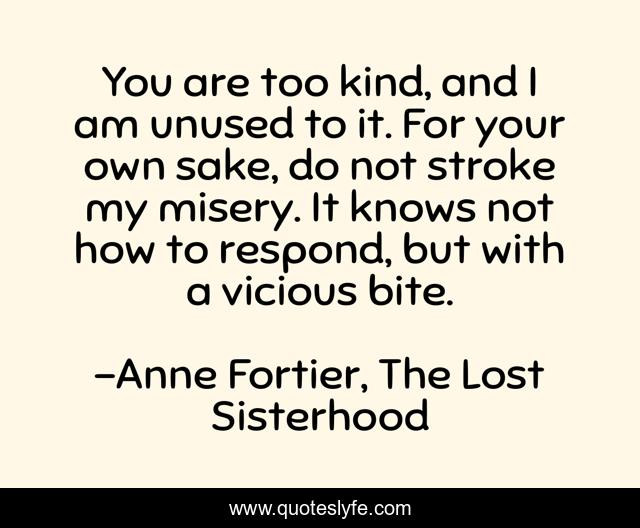 This page presents the quote "You are too kind, and I am unused to it. For your own sake, do not stroke my misery. It knows not how to respond, but with a vicious bite.". Author of this quote is Anne Fortier, The Lost Sisterhood. This quote is about warriors, misery, kindness-compassion, misery-loves-company,.