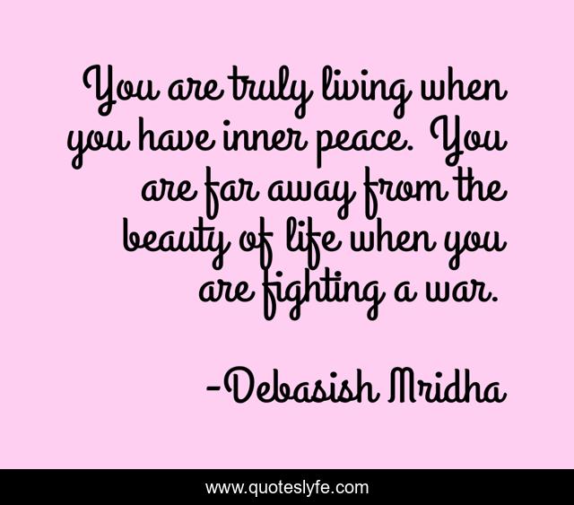 This page presents the quote "You are truly living when you have inner peace. You are far away from the beauty of life when you are fighting a war.". Author of this quote is Debasish Mridha. This quote is about fighting-a-war, philosophy, debasish-mridha, quotes, inspirational, enthusiasm, beauty-of-life, debasish-mridha-m-d, inner-peace,.