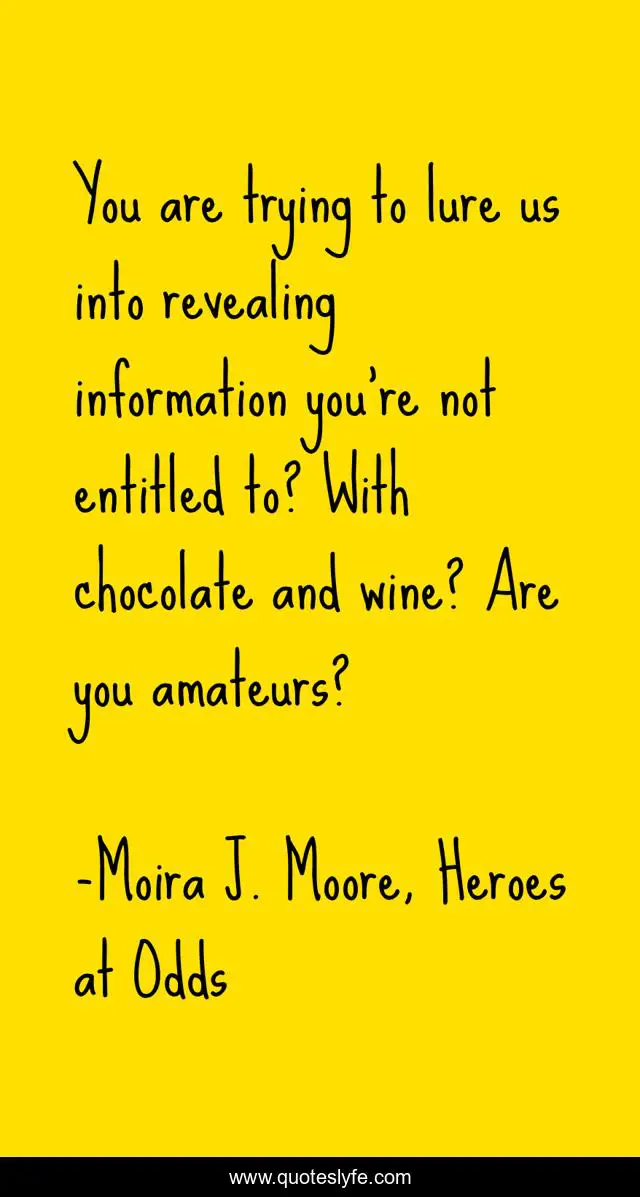 This page presents the quote "You are trying to lure us into revealing information you're not entitled to? With chocolate and wine? Are you amateurs?". Author of this quote is Moira J. Moore, Heroes at Odds. This quote is about secrets, information, amateurs, chocolate, wine,.