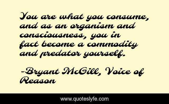 This page presents the quote "You are what you consume, and as an organism and consciousness, you in fact become a commodity and predator yourself.". Author of this quote is Bryant McGill, Voice of Reason. This quote is about commodity, consciousness, predator,.