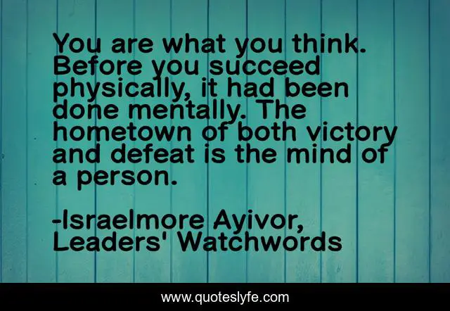 This page presents the quote "You are what you think. Before you succeed physically, it had been done mentally. The hometown of both victory and defeat is the mind of a person.". Author of this quote is Israelmore Ayivor, Leaders' Watchwords. This quote is about food-for-thought, s-ideas, mental, success, successful, hometown, thought, person, succeed,.